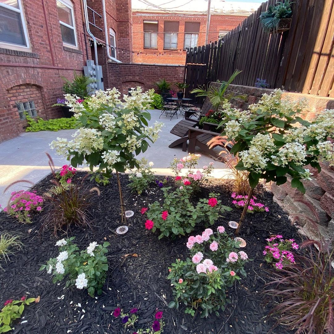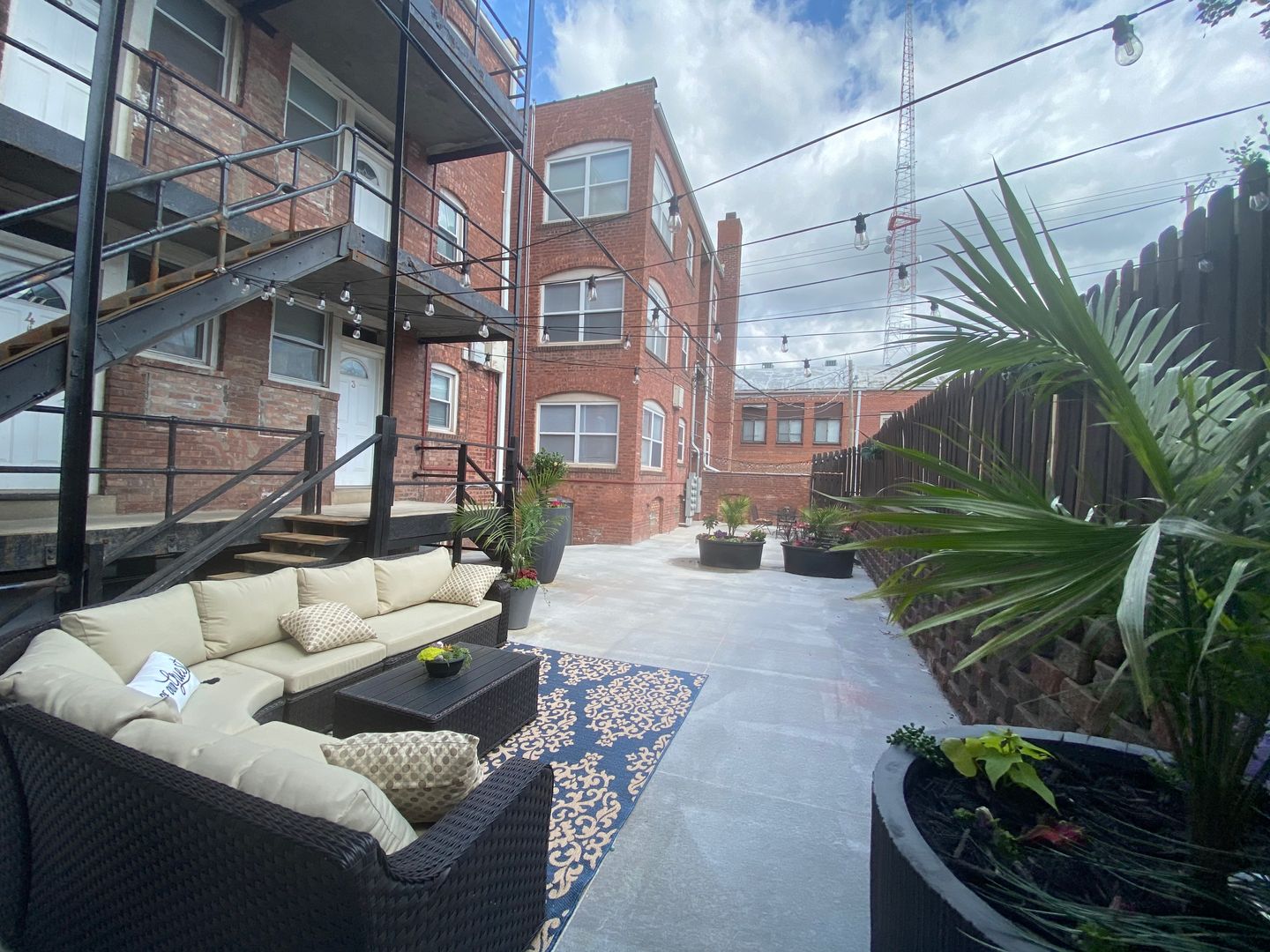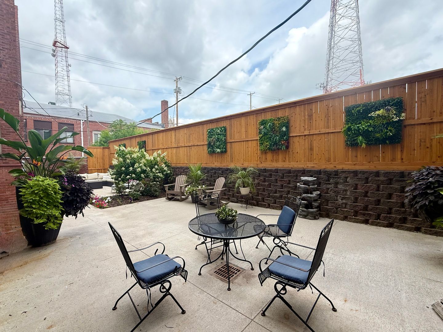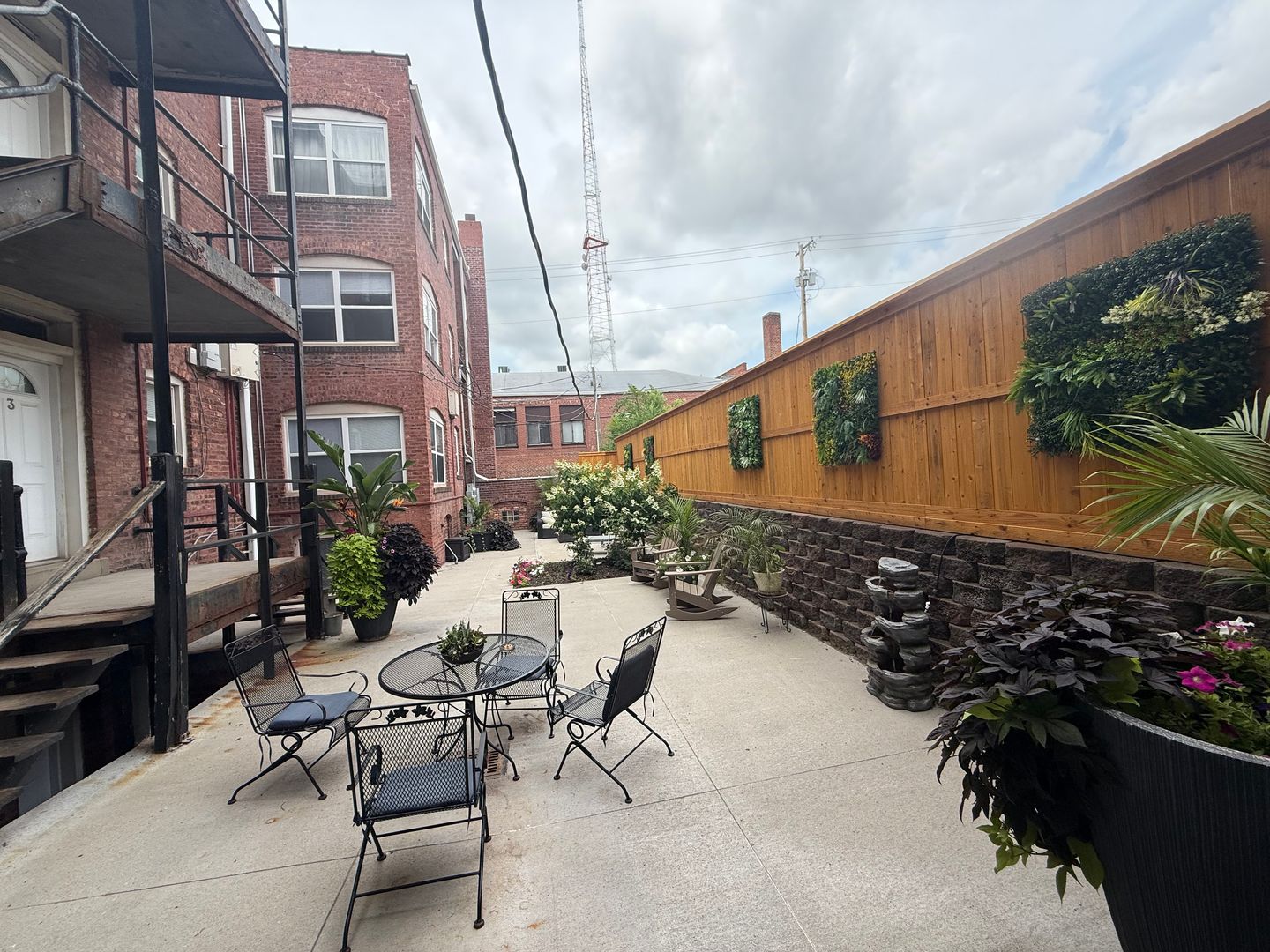 Private fenced courtyard featuring a fountain, flowers, and comfortable seating areas.
