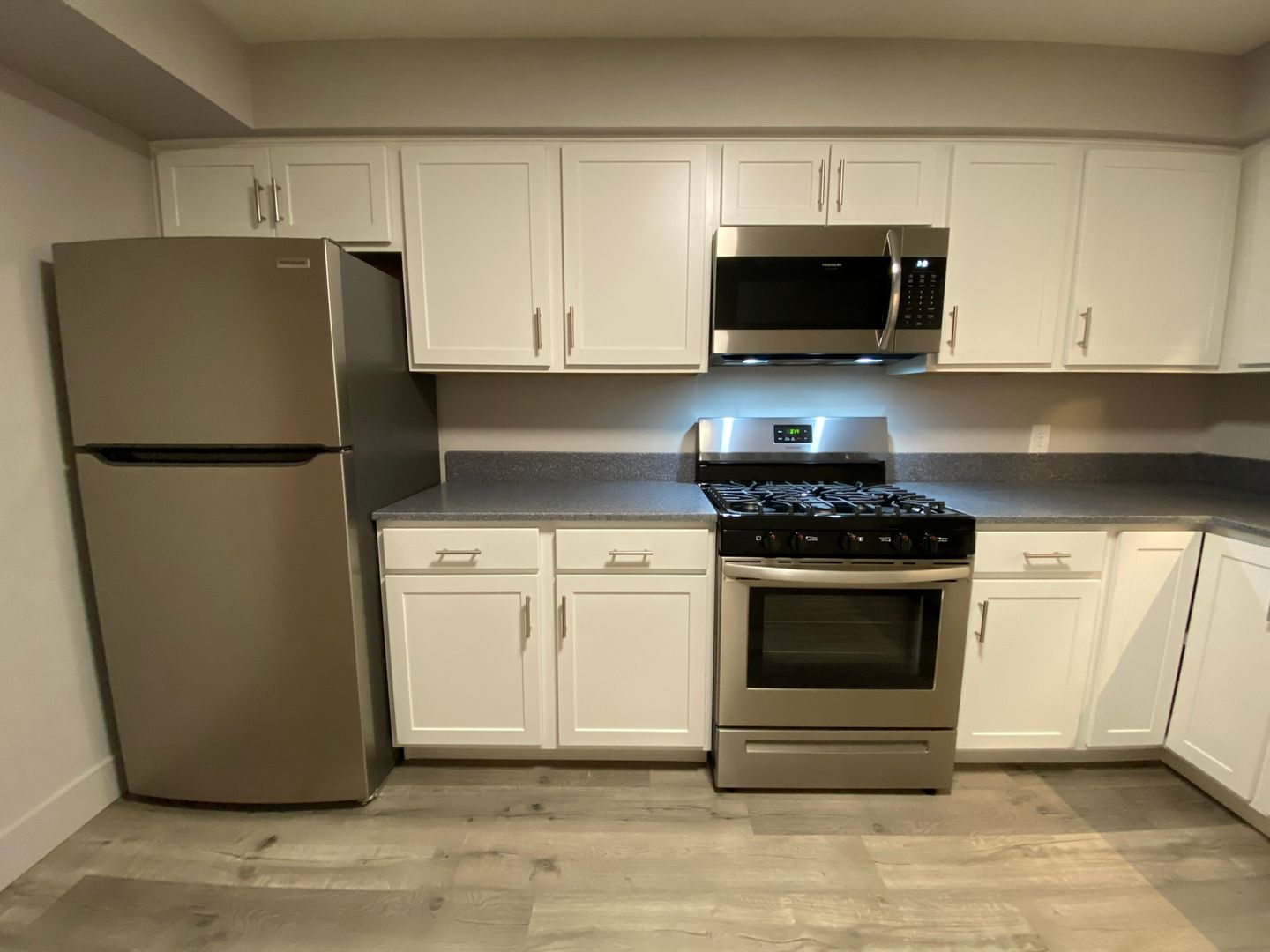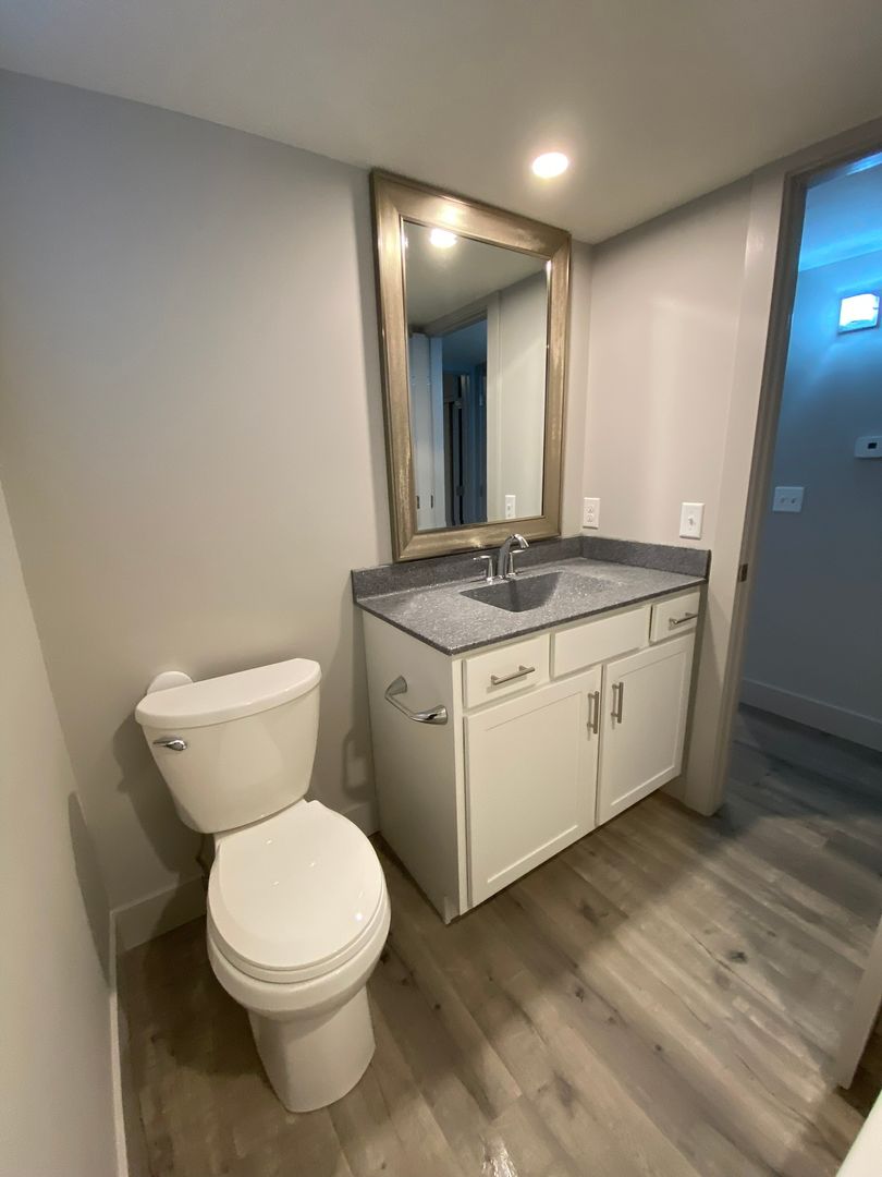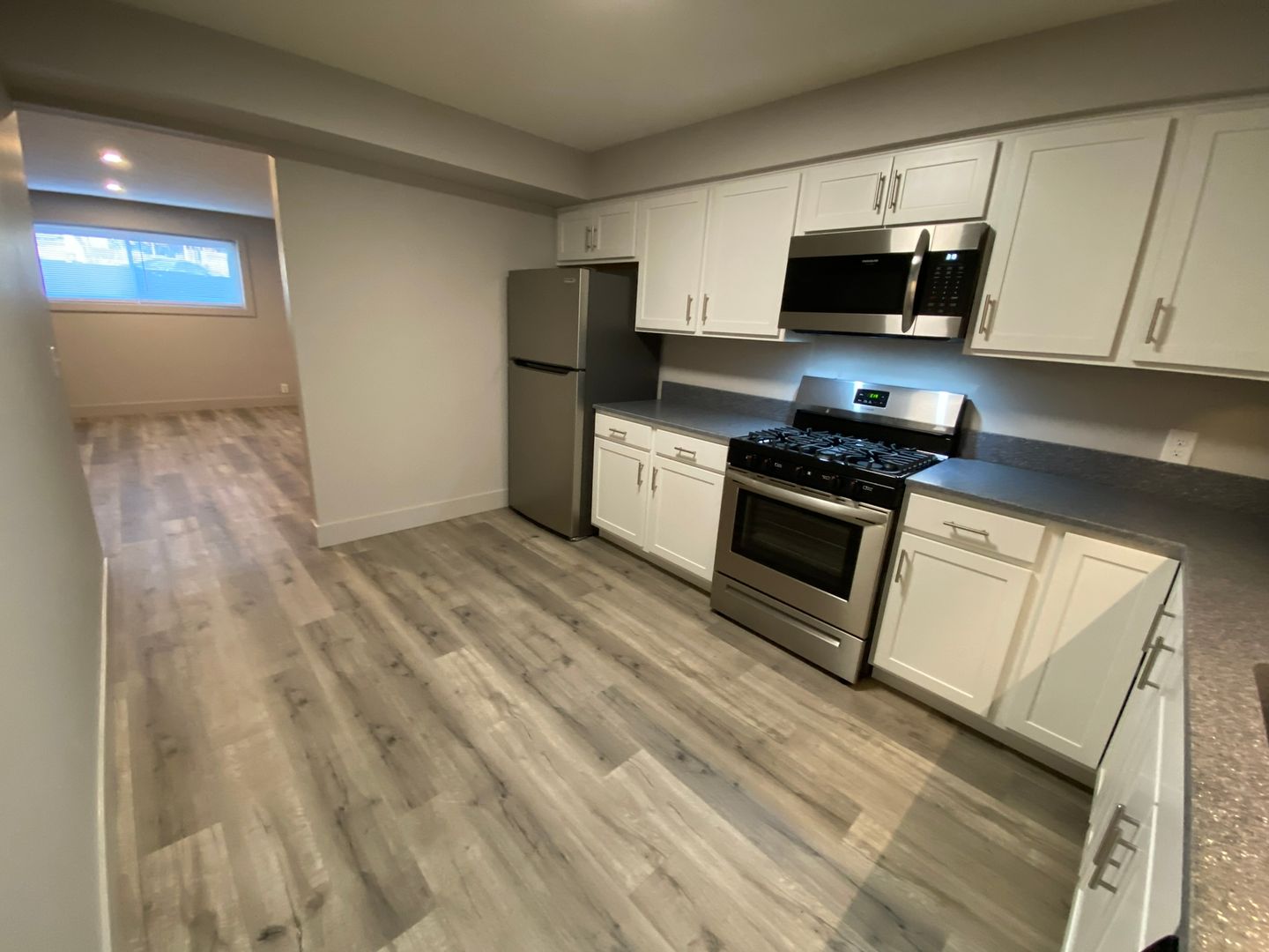 The modern amenities include stainless steel appliances, a dishwasher, microwave, gas stove, and solid surface counters. The laminate flooring gives the space a sleek finish, while Kohler fixtures and energy-efficient LED lighting add a touch of elegance.