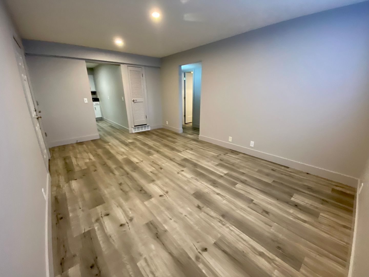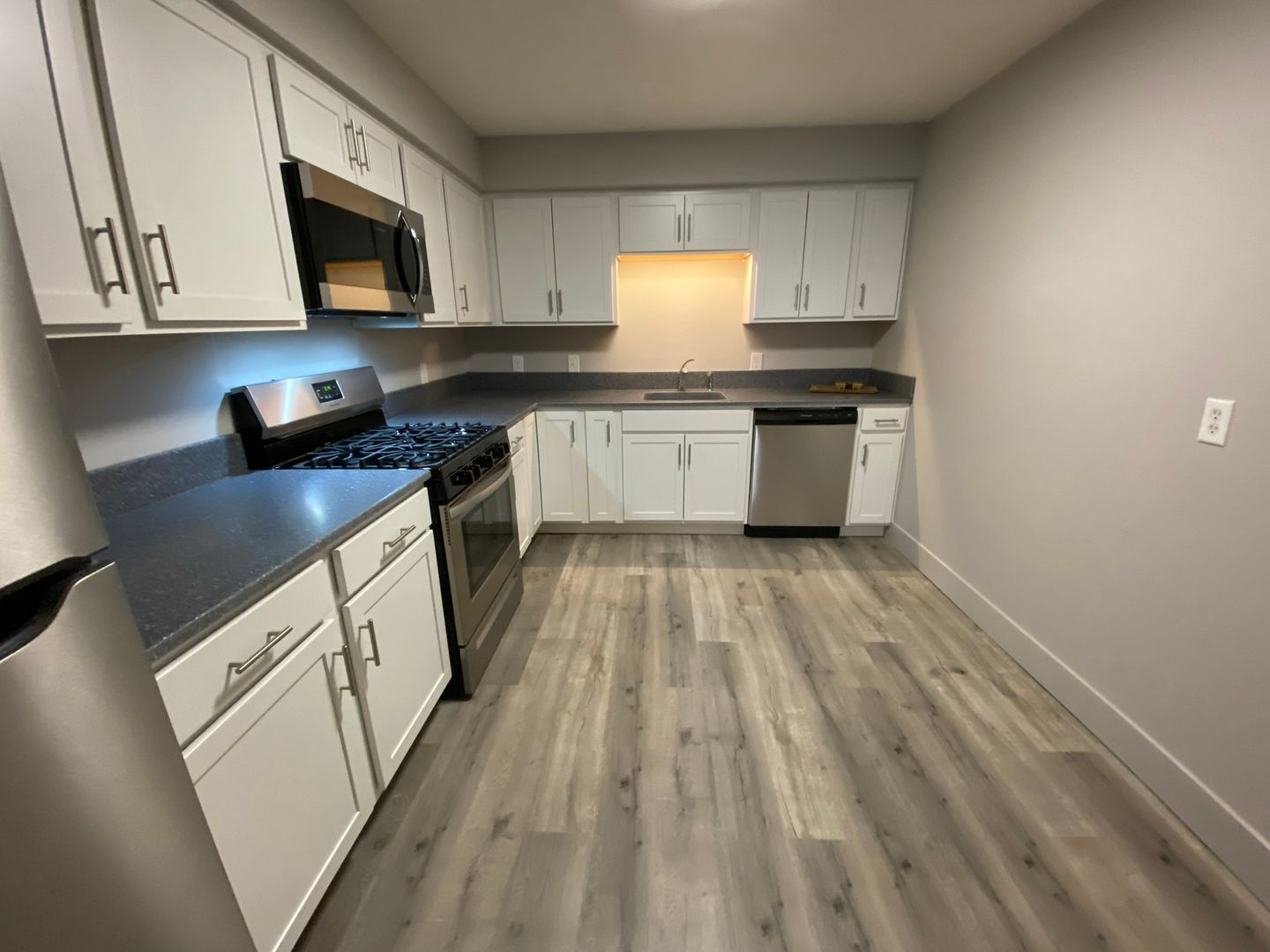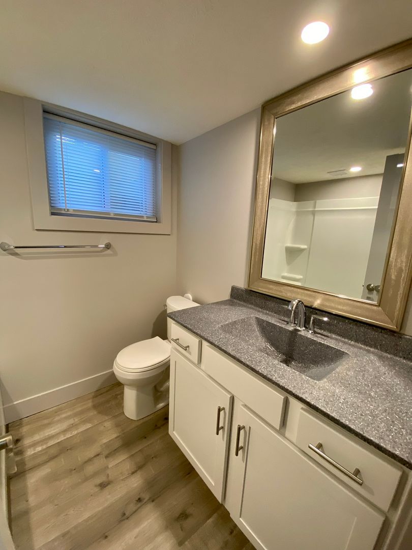 The modern amenities include stainless steel appliances, a dishwasher, microwave, gas stove, and solid surface counters. The laminate flooring gives the space a sleek finish, while Kohler fixtures and energy-efficient LED lighting add a touch of elegance.