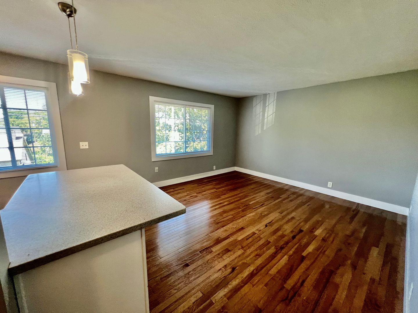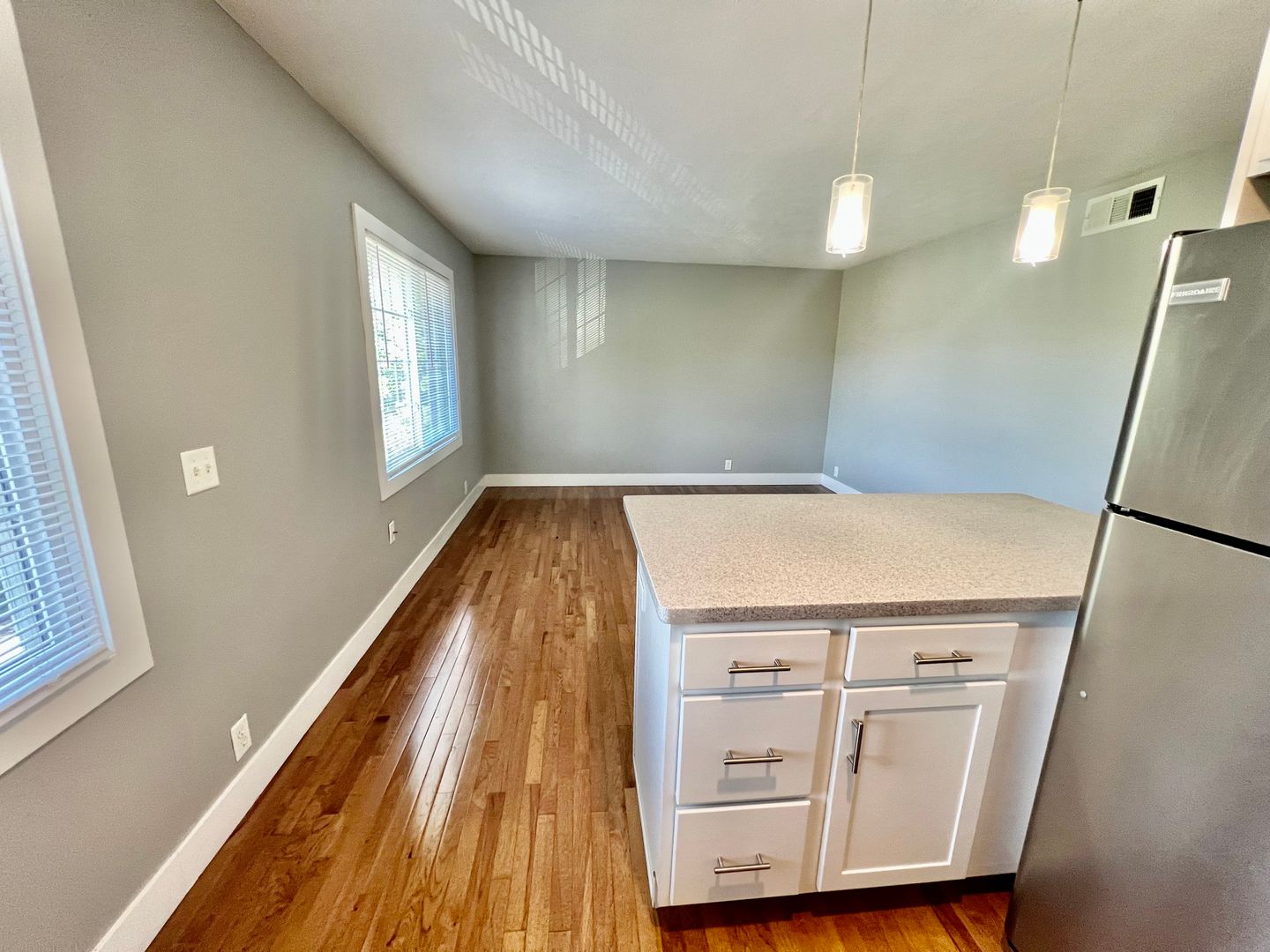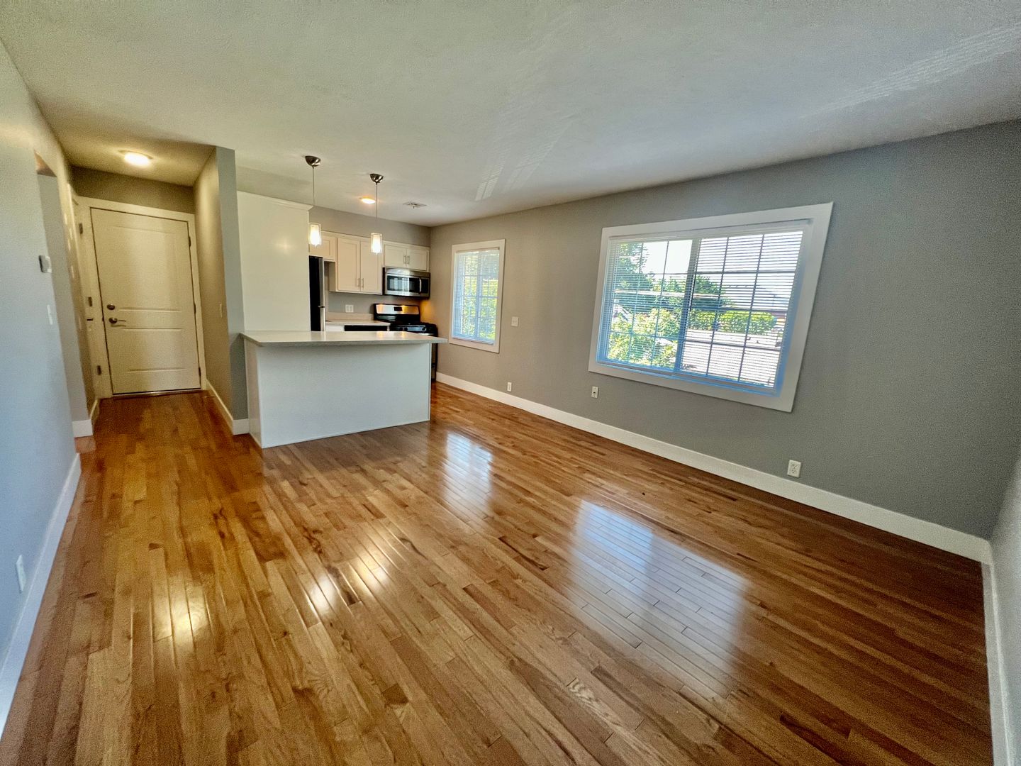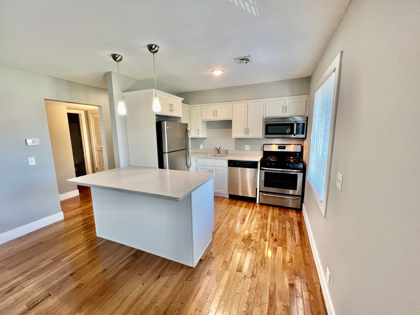 The modern amenities include stainless steel appliances, a dishwasher, microwave, gas stove, and solid surface counters. The hardwood flooring gives the space an modern finish, while Kohler fixtures and energy-efficient LED lighting add a touch of elegance.